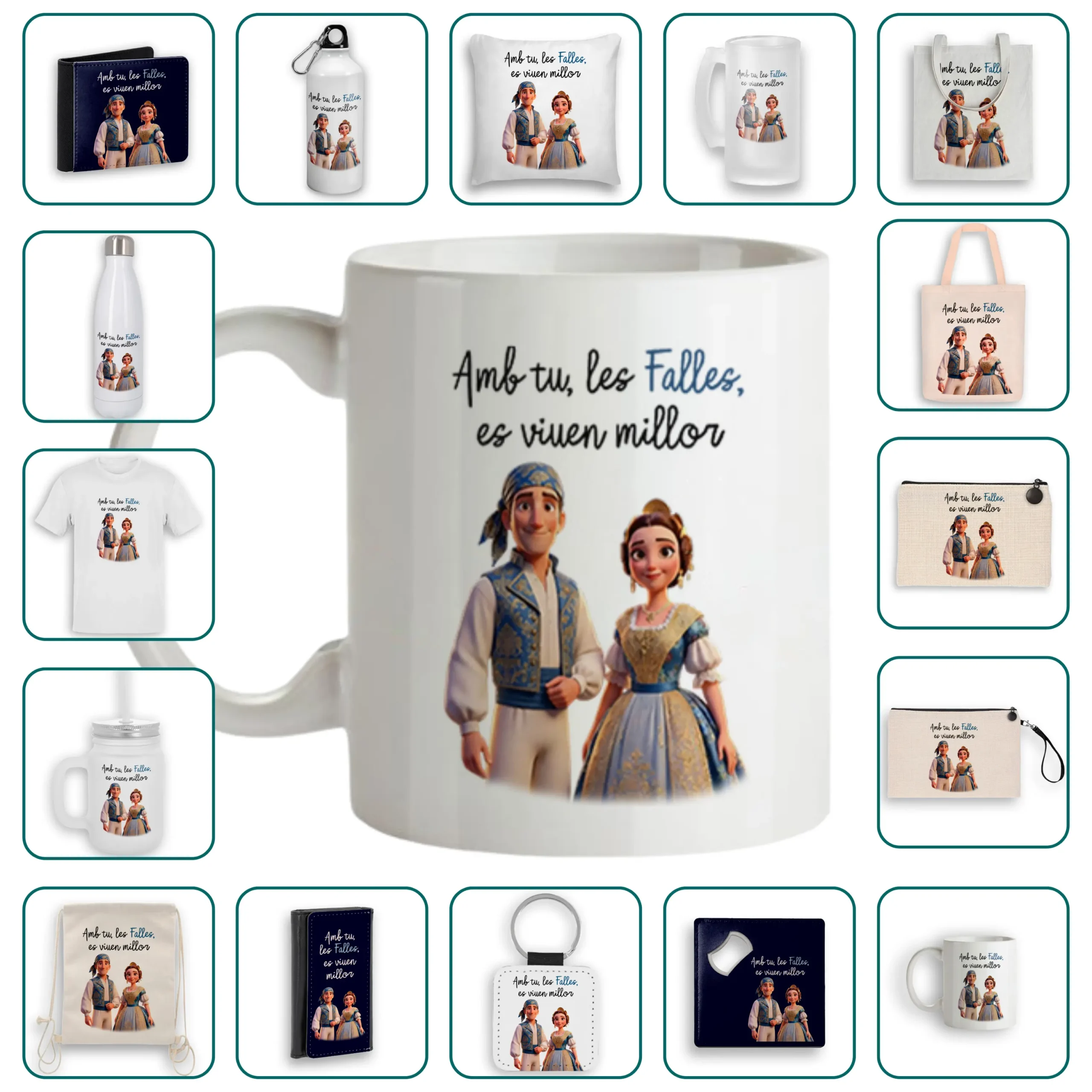 El diseño “Amb tu, les falles, es viuen millor” es perfecto para sorprender a quien siempre tiene un abrazo preparado. Puedes aplicarlo al regalo que prefieras —una taza, un cojín, una bolsa o cualquiera de nuestros artículos— y crear un detalle lleno de emoción y cariño.