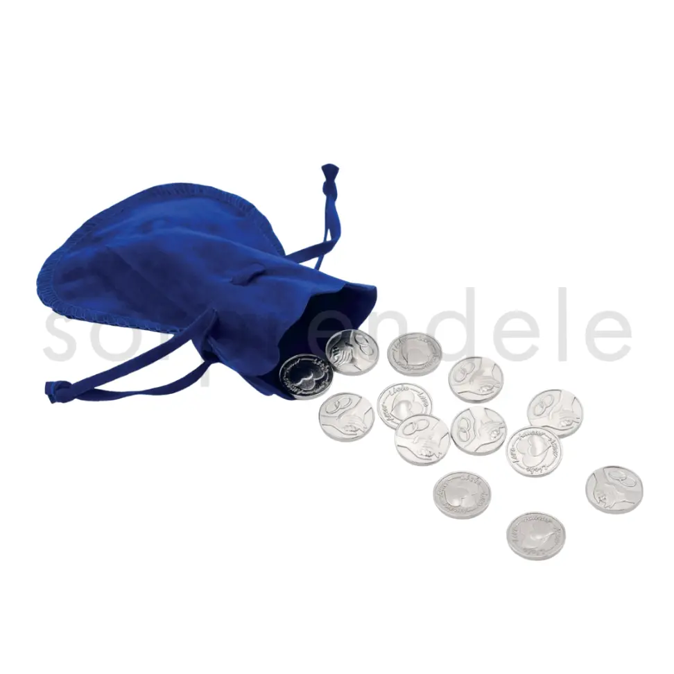 Las arras plateadas 20 mm bolsa terciopelo azul son un elemento clásico y simbólico en las ceremonias de boda, representando prosperidad, compromiso y unión en uno de los momentos más especiales del enlace.