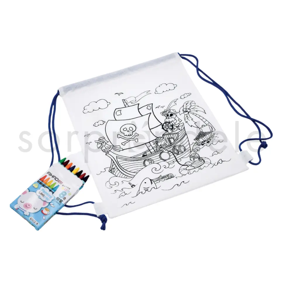 Esta bolsa piratas para colorear con 5 pinturas incluye 5 pinturas de colores, permitiendo que cada niño cree su propio diseño y disfrute de una experiencia entretenida y educativa. Además, una vez decorada, podrá utilizarse para guardar juguetes, accesorios o pequeños objetos.