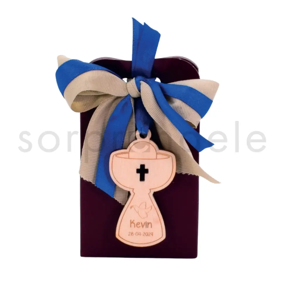 Esta cajita colgante azul cáliz personalizado con 4 peladillas destaca por su diseño decorativo en color azul con colgante de cáliz personalizado, símbolo tradicional de la comunión, aportando un estilo elegante y significativo. Cada unidad se convierte en un recuerdo único para los invitados.
