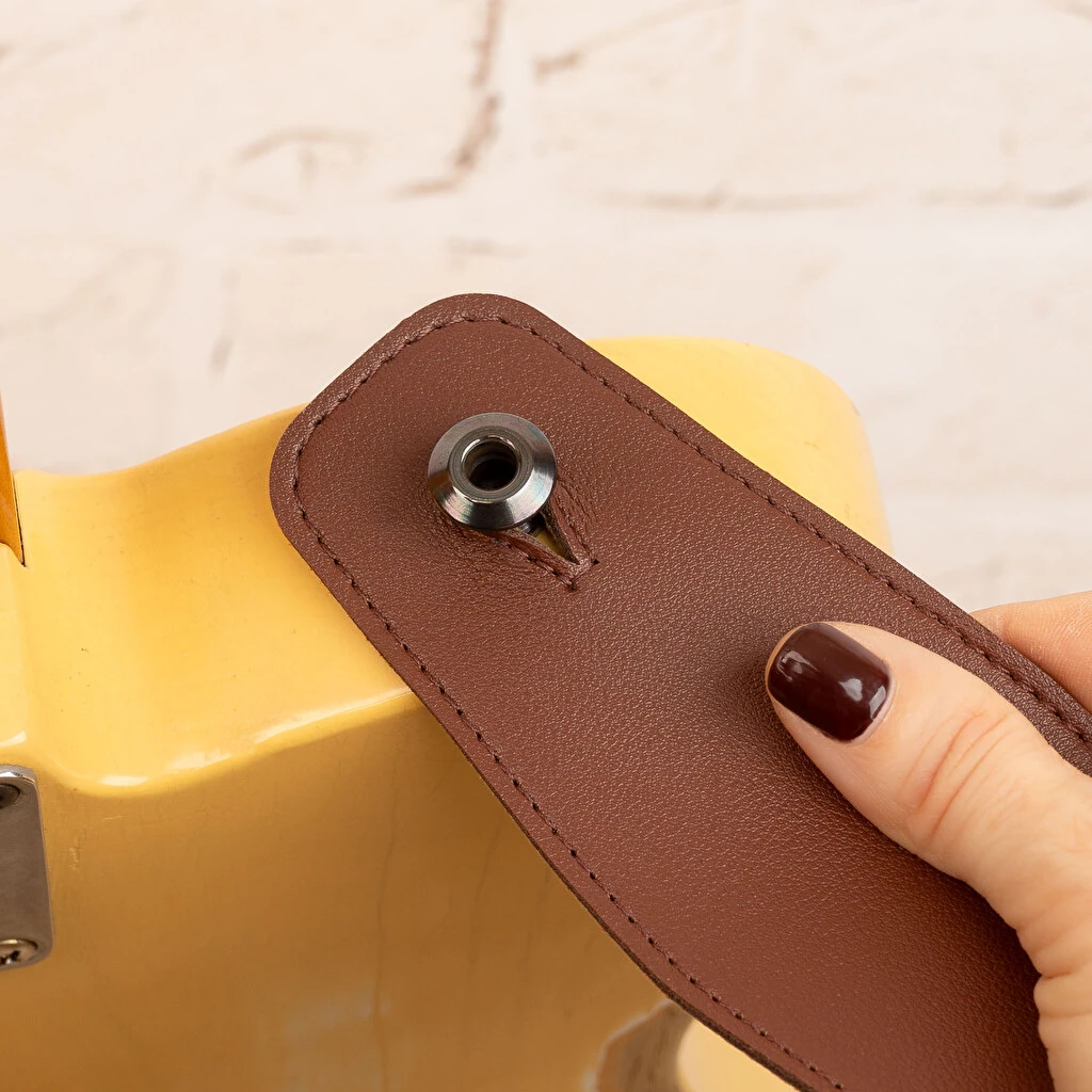 Fabricada en cuero PU de color marrón, ofrece un tacto suave pero firme, pensado para acompañarte durante ensayos, jam sessions o actuaciones en directo. Incorpora perforaciones para ajustar la longitud, lo que permite adaptarla fácilmente a diferentes alturas y preferencias personales.