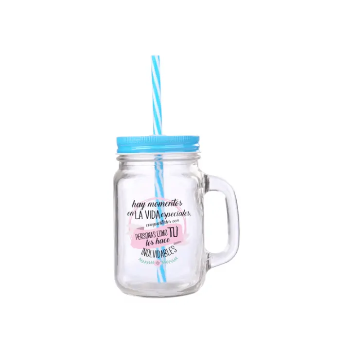 La Jarra de cristal con asa y tapa metálica es un detalle original y práctico, perfecto para regalar en celebraciones, eventos o como recuerdo especial. Su diseño combina el estilo clásico del cristal con un toque moderno gracias a su tapa metálica de color y la caña de PVC a juego.