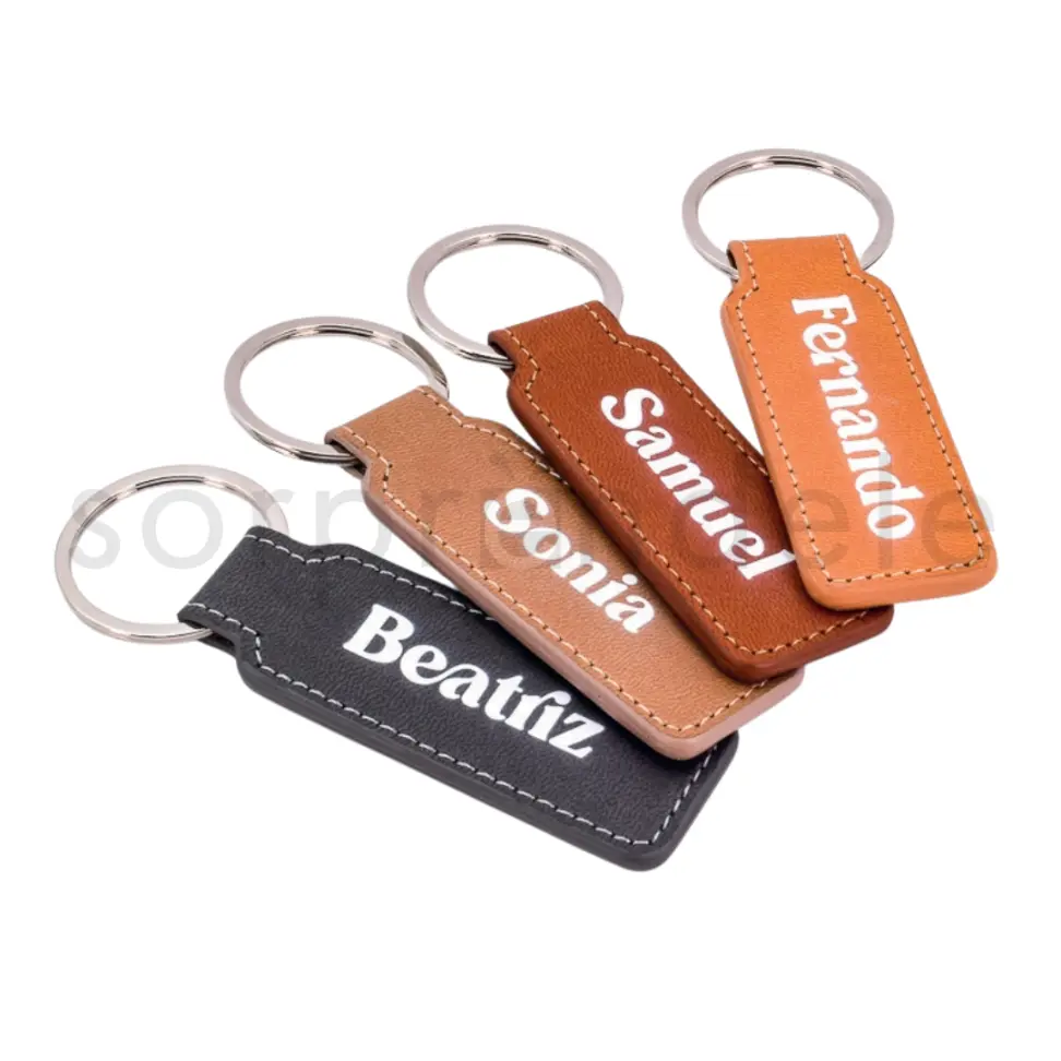 Este llavero polipiel nombre blanco se presenta en modelos surtidos, lo que añade variedad y dinamismo a la presentación de las mesas, manteniendo siempre una estética cuidada y uniforme.