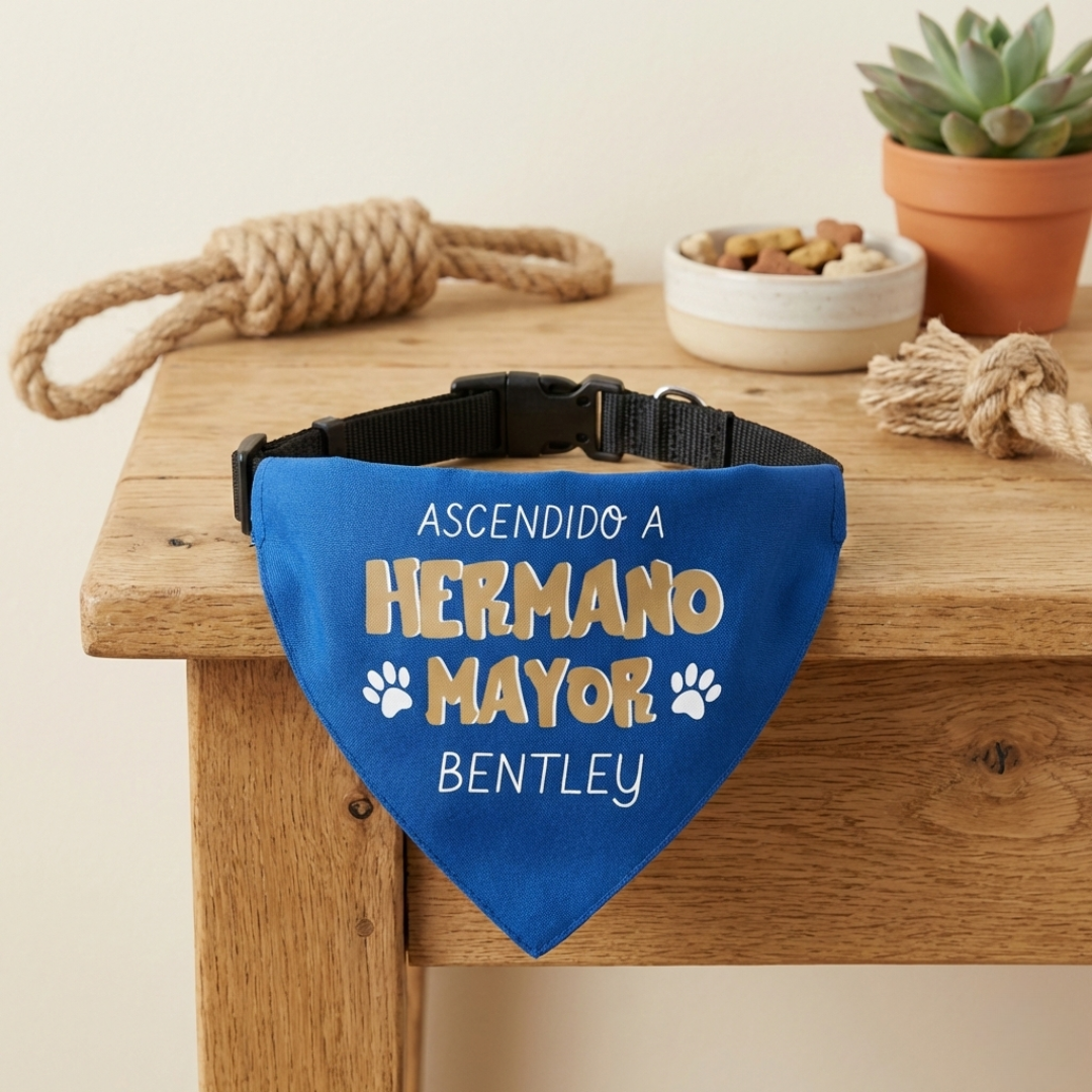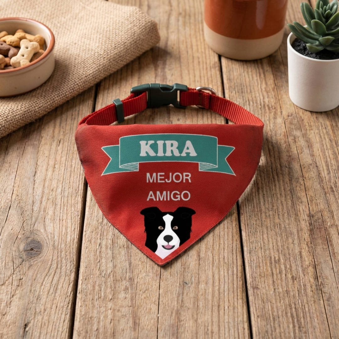 Pero lo mejor de todo es la posibilidad de personalización. Con nuestro sencillo editor online, puedes añadir cualquier imagen, diseño o texto a la bandana de tu mascota. ¿Quieres poner el nombre de tu mascota para que todos lo reconozcan en el parque? ¿O prefieres una foto suya para mostrar lo precioso que es? Puedes crear cualquier diseño que quieras. La personalización es ilimitada, lo que te permite crear un pañuelo único y exclusivo que refleje la personalidad de tu mascota.
