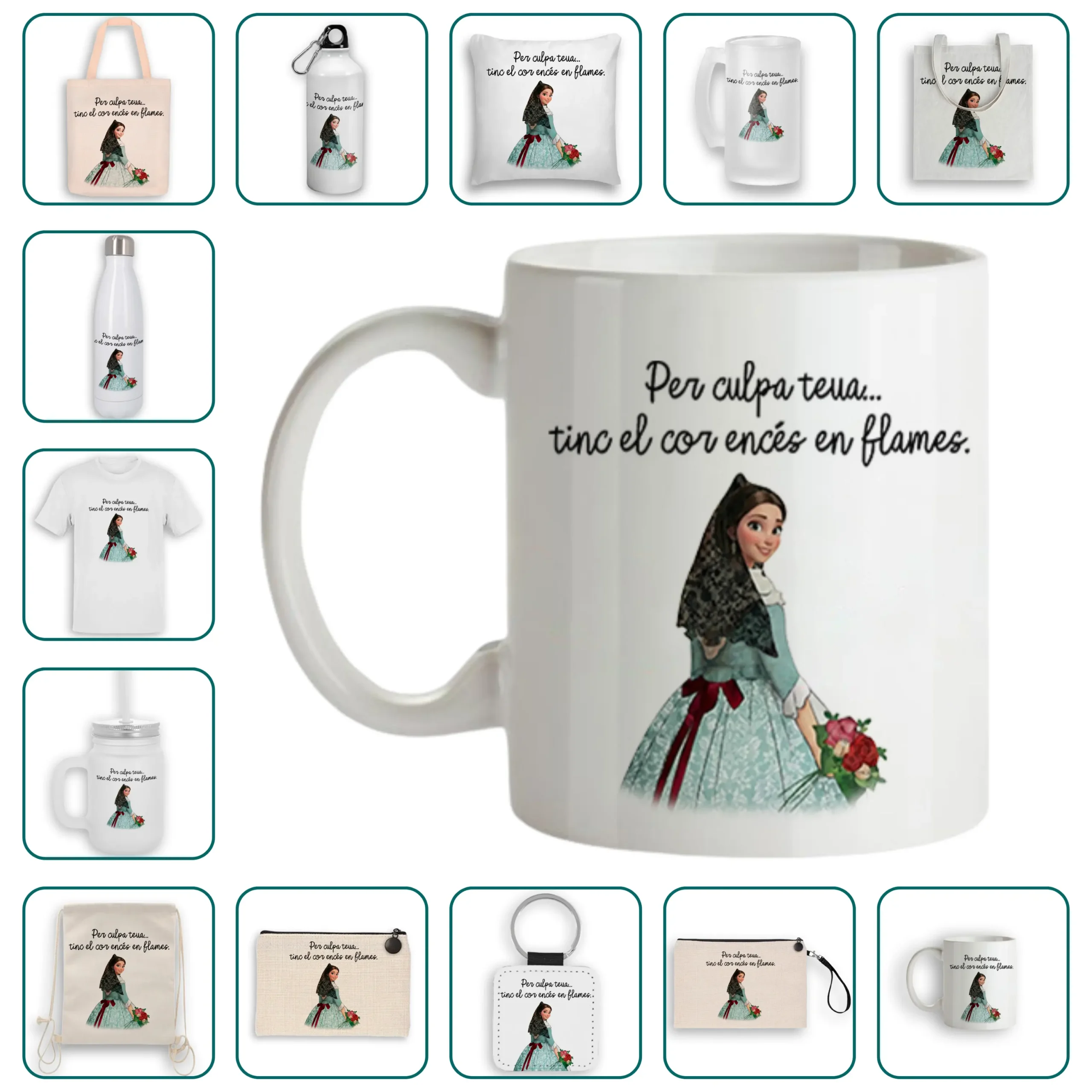 El diseño “Per culpa teua, tinc el cor encés en flames” es perfecto para sorprender a quien siempre tiene un abrazo preparado. Puedes aplicarlo al regalo que prefieras —una taza, un cojín, una bolsa o cualquiera de nuestros artículos— y crear un detalle lleno de emoción y cariño.