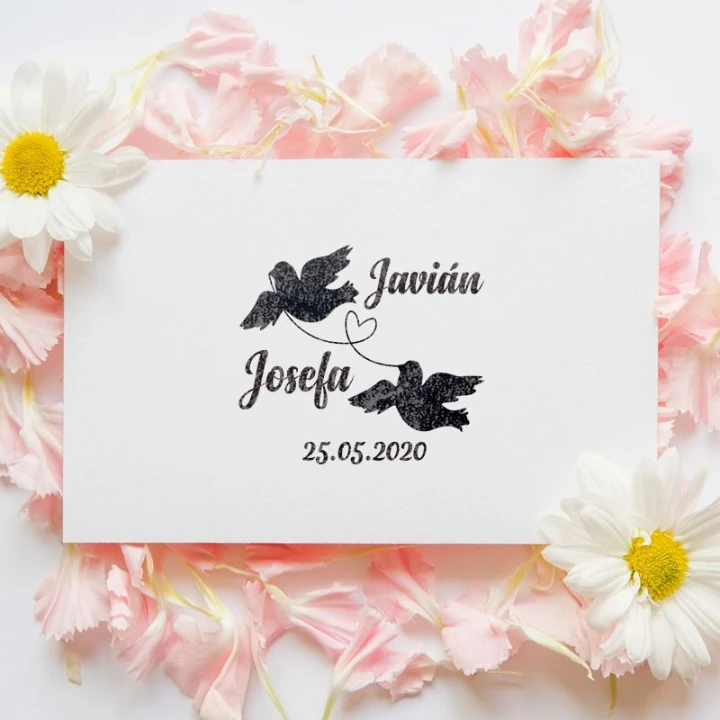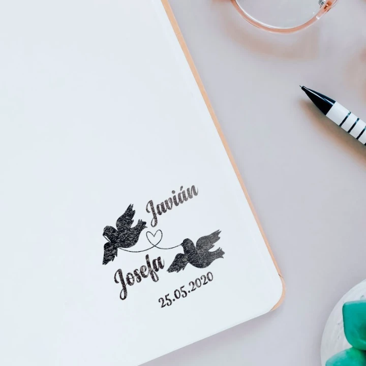 Con medidas de 40×40 mm, este sello está hecho para destacar sin abrumar. Su diseño personalizado incluye vuestros nombres y la fecha de vuestro enlace, lo que lo convierte en un recuerdo duradero de vuestro amor y compromiso.