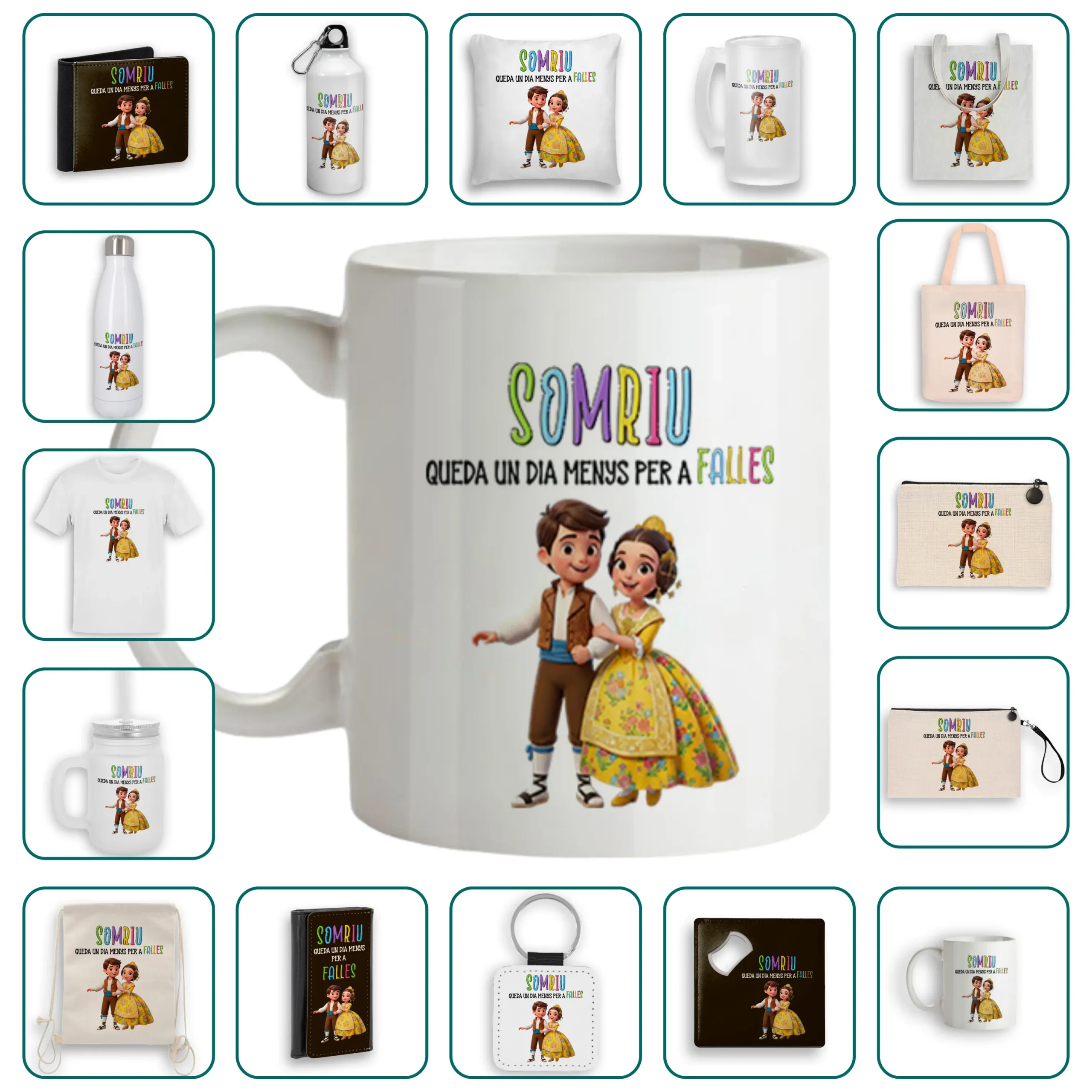 El diseño “Somriu, queda un dia menys per a falles” es perfecto para sorprender a quien siempre tiene un abrazo preparado. Puedes aplicarlo al regalo que prefieras —una taza, un cojín, una bolsa o cualquiera de nuestros artículos— y crear un detalle lleno de emoción y cariño.
