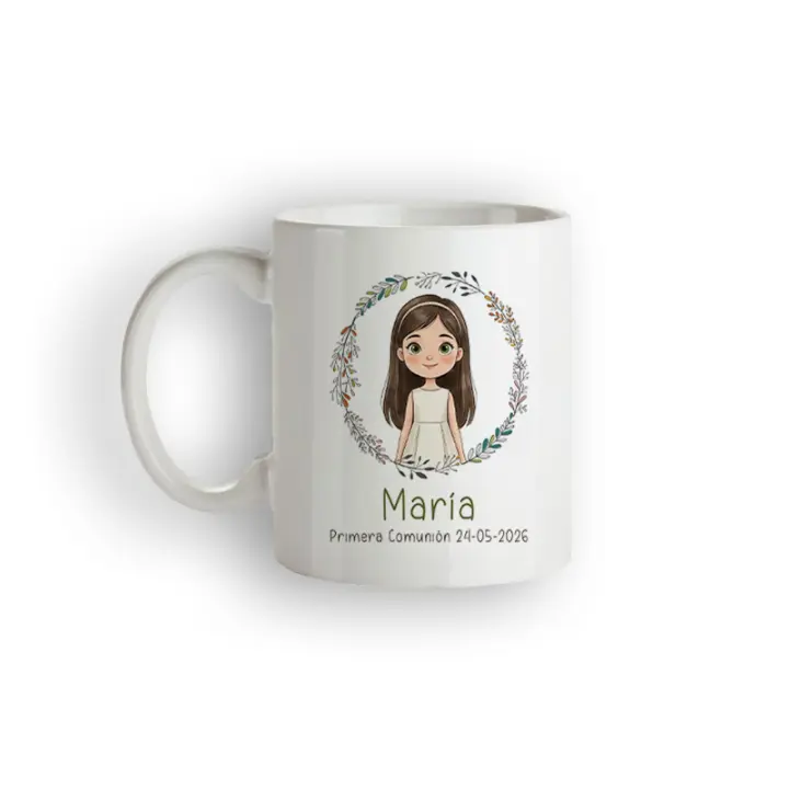 Fabricada en cerámica de alta calidad, presenta un acabado brillante que hace que el diseño personalizado destaque con gran nitidez. Permite personalizarla con nombre, fecha o diseño de comunión, creando un recuerdo único del evento.